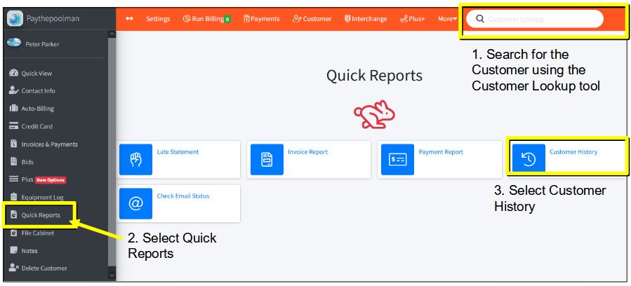 Please call or text to 951-234-5166 or email us at support@paythepoolman.com if you need any assistance in accessing or employing the Customer History Quick Report.