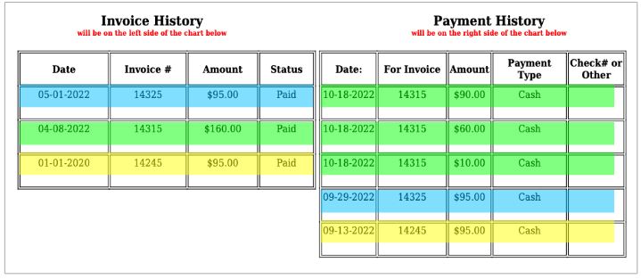 A formatted letter is generated in PDF format to the customer from your company. Below the letter are two tables: on the left is Invoice History, and on the right is Payment History as shown above.