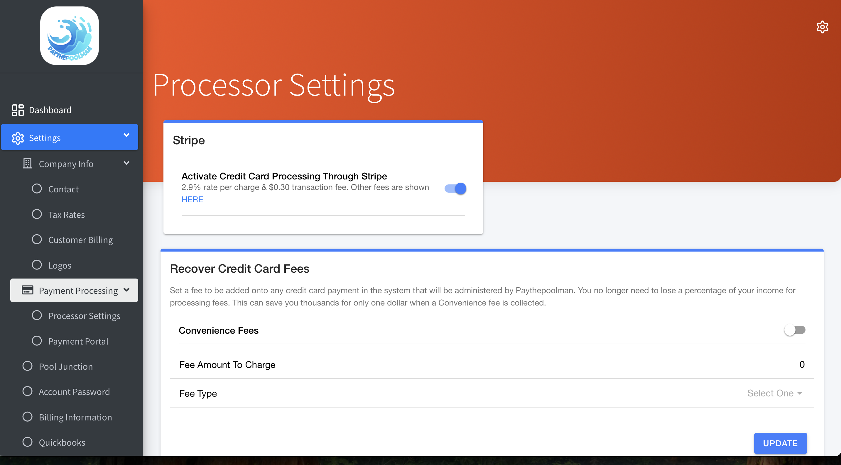 You can collect a flat rate for each charge or set the percentage rate to recover the fees. This option will be applied to ALL credit card and debit card transactions from your customers. This feature is NOT available for ACH.