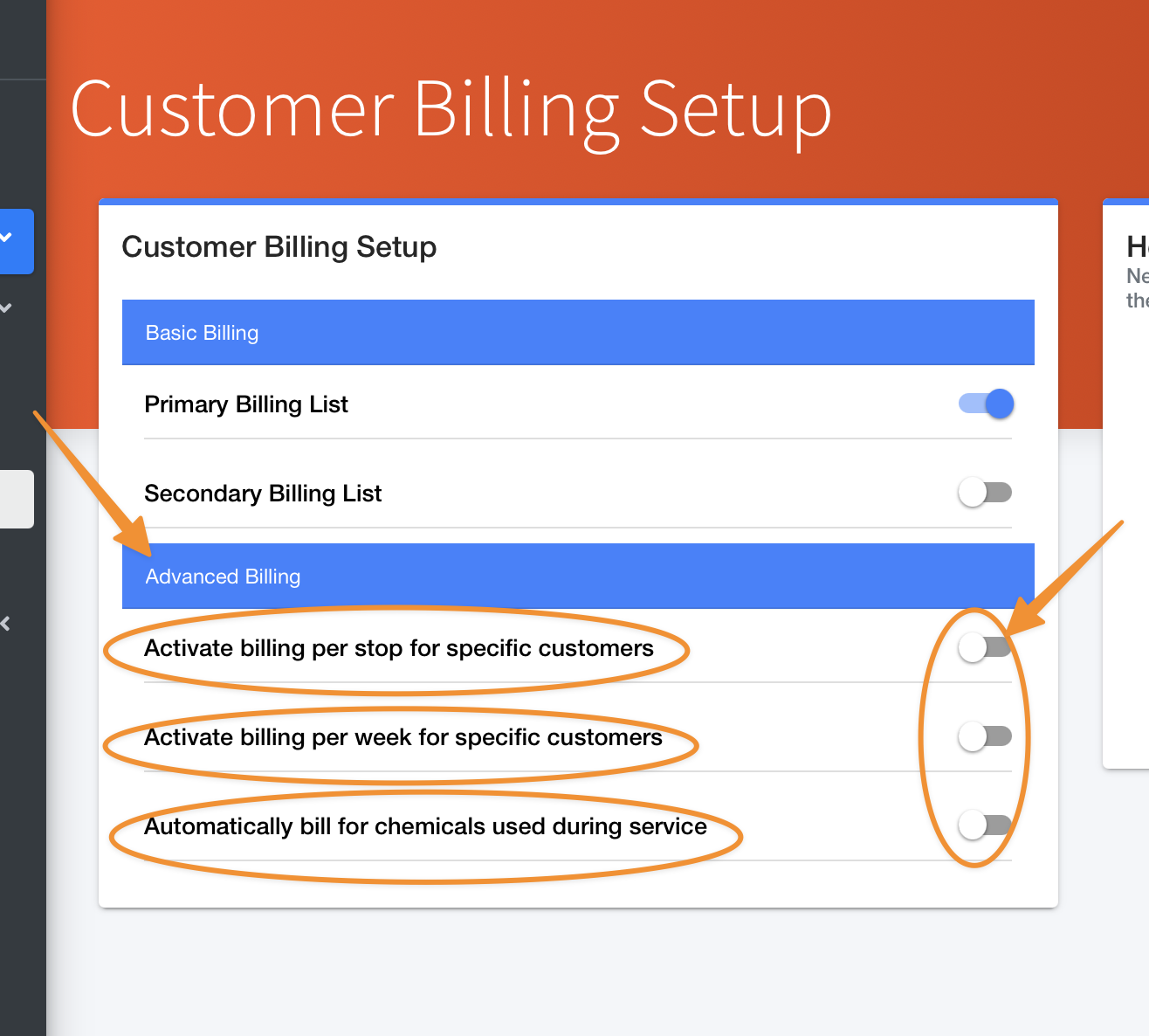 4) Below that section, you'll see ADVANCED BILLING. These options include ACTIVATE BILLING PER STOP FOR SPECIFIC CUSTOMERS, ACTIVATE BILLING PER WEEK FOR SPECIFIC CUSTOMERS, and AUTOMATICALLY BILL FOR CHEMICALS USED DURING SERVICE. You can select ALL of these, NONE of them, or any combination of the three by toggling the option on/off, which is to the right of each option. Whatever selection you make, this information will be automatically pulled from your Active Customers' Profiles into the Invoices generated when you Run Billing.