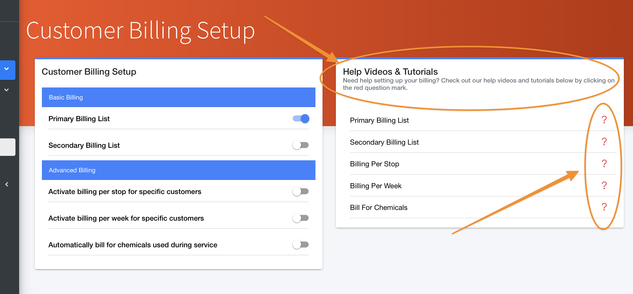3) Under BASIC BILLING, you can select between either your PRIMARY or SECONDARY BILLING LIST. (This is helpful for those who want to bill all Residential Customers as their Primary Billing List, and all Commercial Customers as the Secondary Billing List, for example.) Use the TOGGLE to the right of each selection to turn that option on or off.