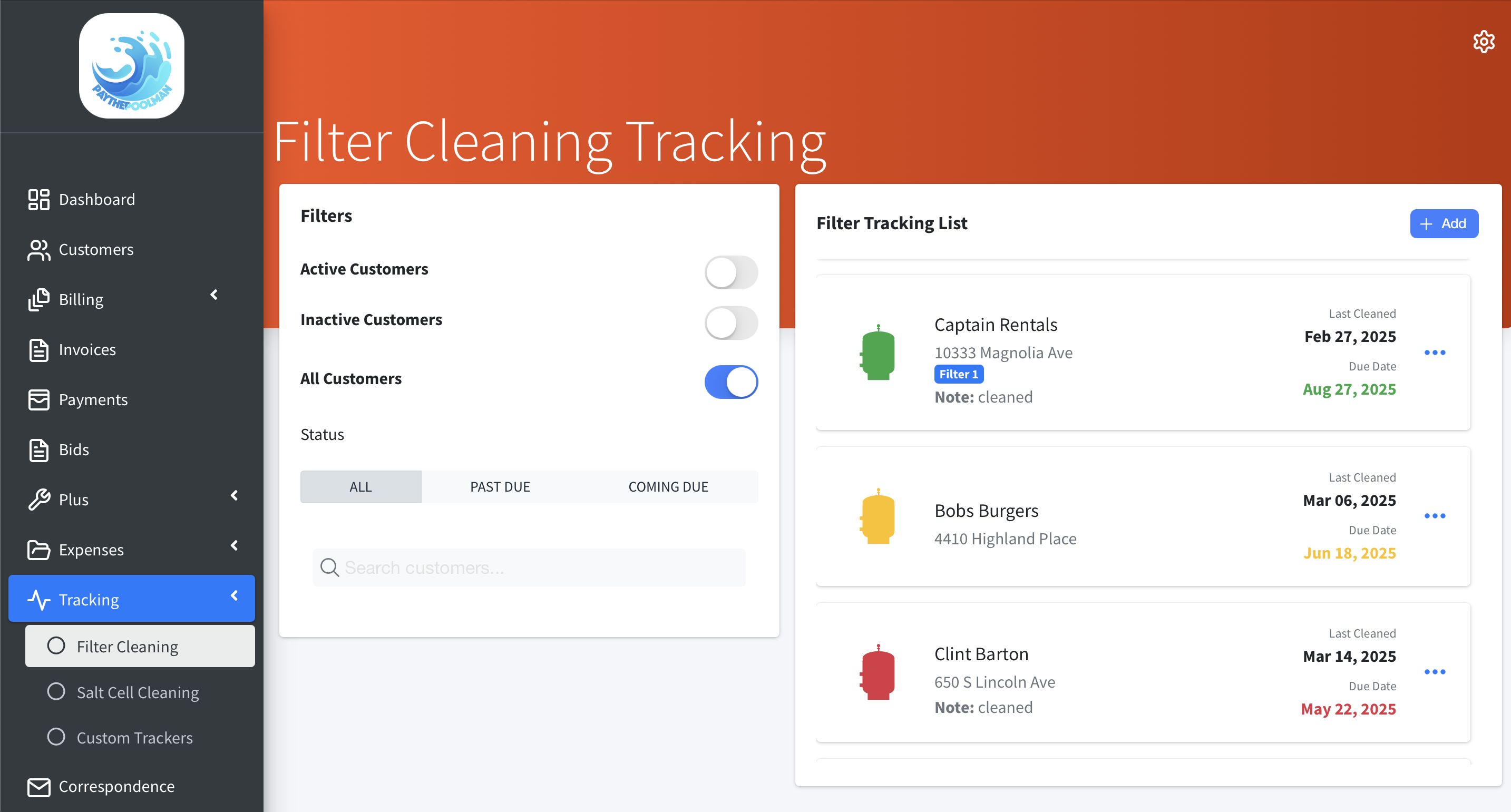 Filter Icons are colored based on date next clean was to be completed. Red signifies overdue, yellow coming due, and green not yet due.