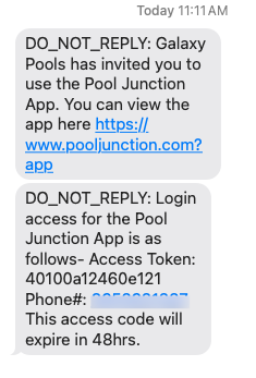 1) After you've enabled the Pool Junction feature in your Company Settings and sent out the Mass Invite to your active customers who have mobile numbers on file, those customers will receive a text. They'll click on the link in the first message to download the free Pool Junction app to their mobile device. Then they'll enter the Token ID to allow them to log in.