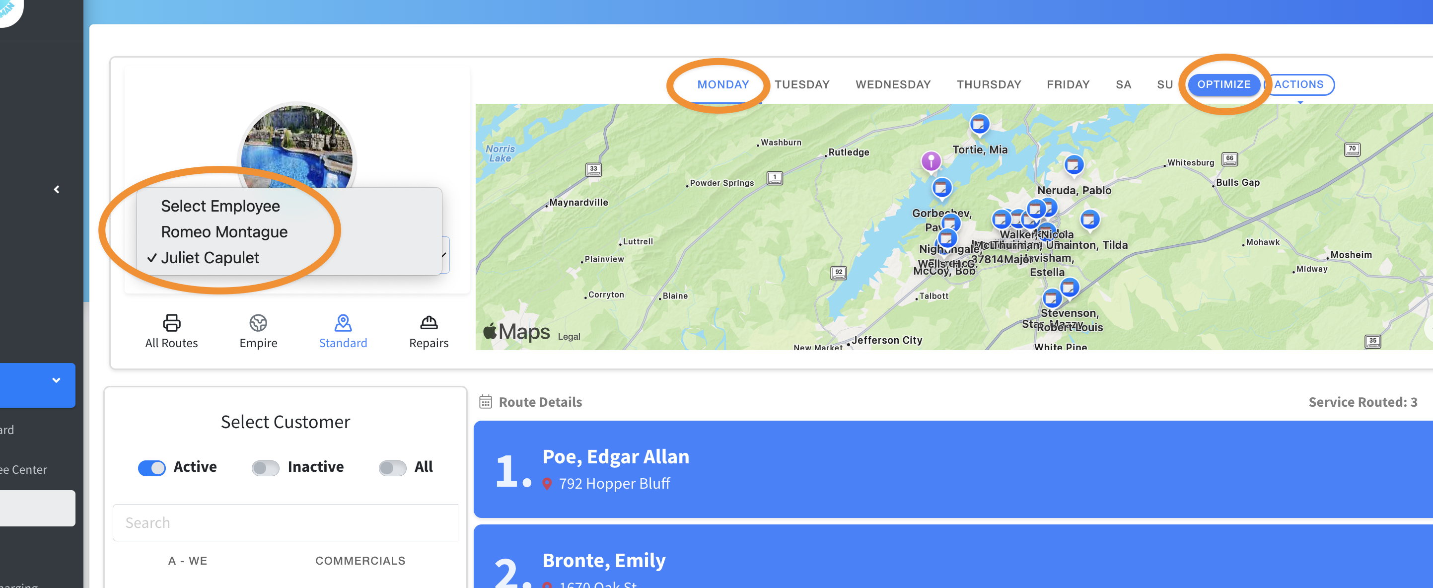 2. Next, select the employee/tech of your choice; select the day; then OPTIMIZE.