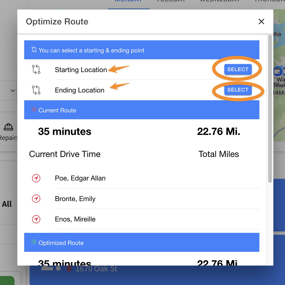 3. Once you click OPTIMIZE, you'll get a pop-up window similar to the one below. Here you can easily select Starting and Ending Location points, then scroll down to SAVE. You will be able to see the distance and time saved by the optimization!