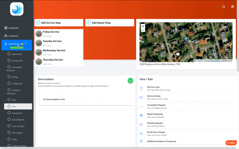 **Please note that if you add a serviceable, ALL BODIES OF WATER need to be added as a serviceable as well so that all water features will be listed on the route. However, when creating a route, the customer only needs to be added ONCE and all the serviceables will be listed on the route.**