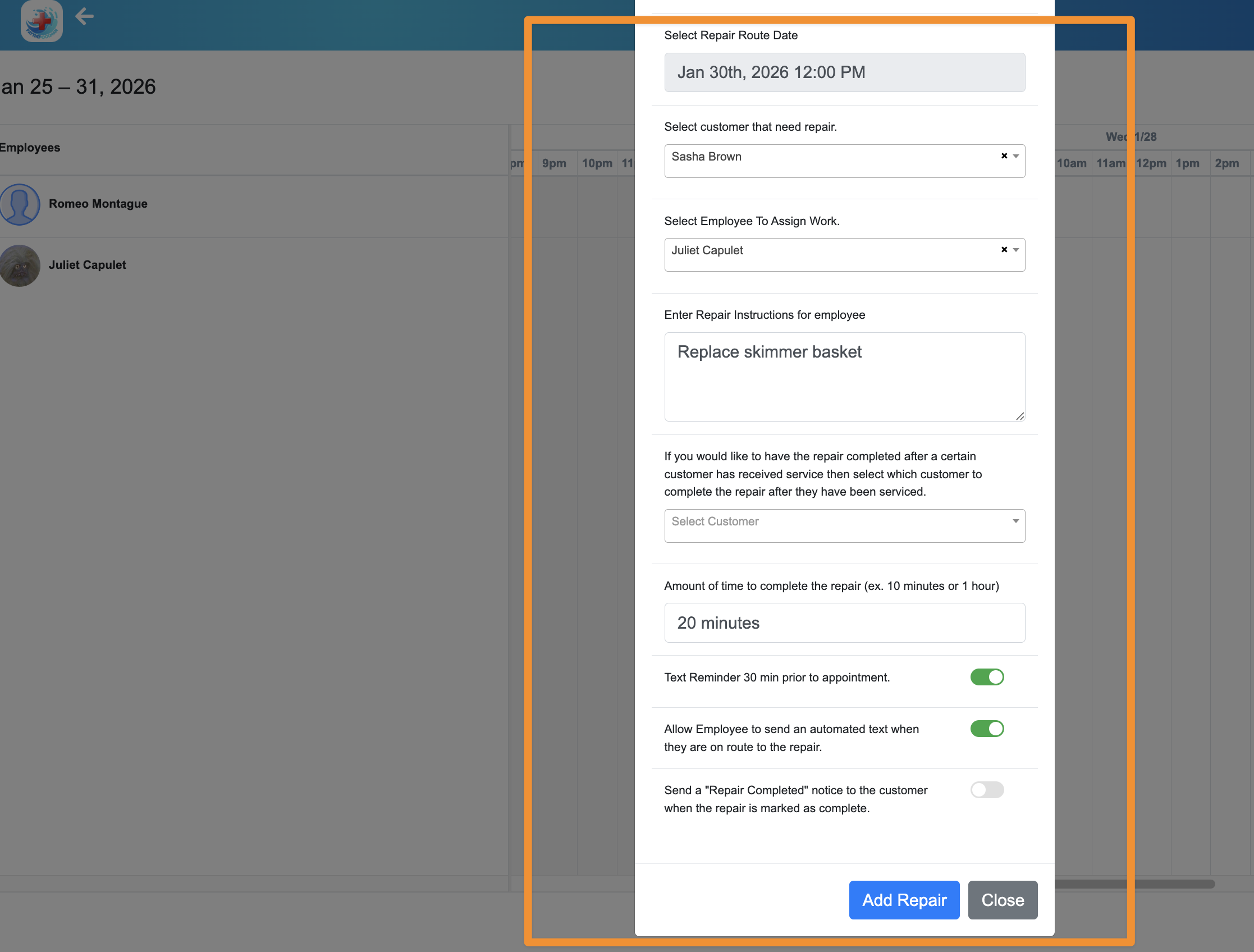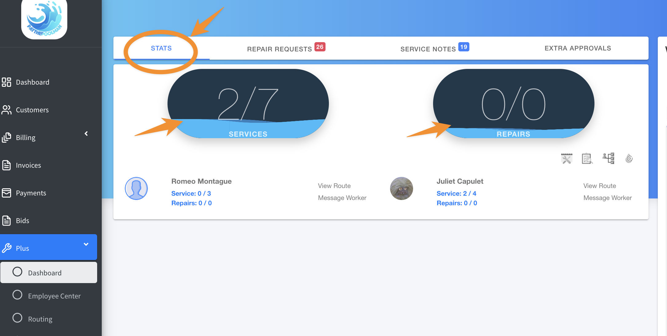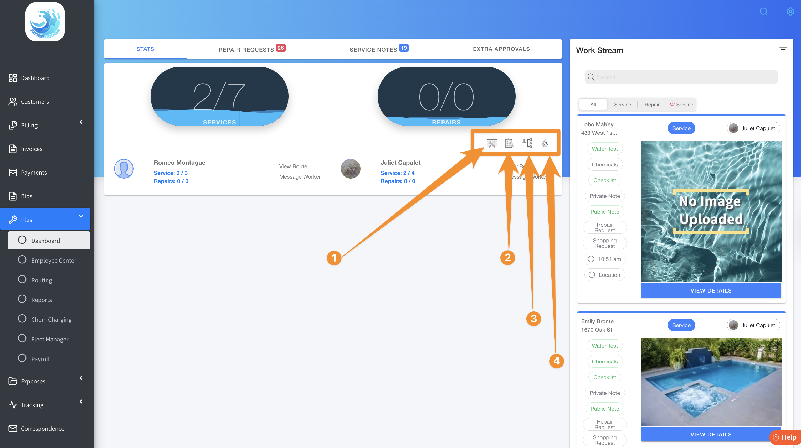 9. There are also four icons under REPAIRS, which will take you directly to the following: (1) REPAIR CALENDAR, (2) SERVICE INSPECTOR, (3) PROGRESS REPORTS, and the (4) CHLORINE REPORT.