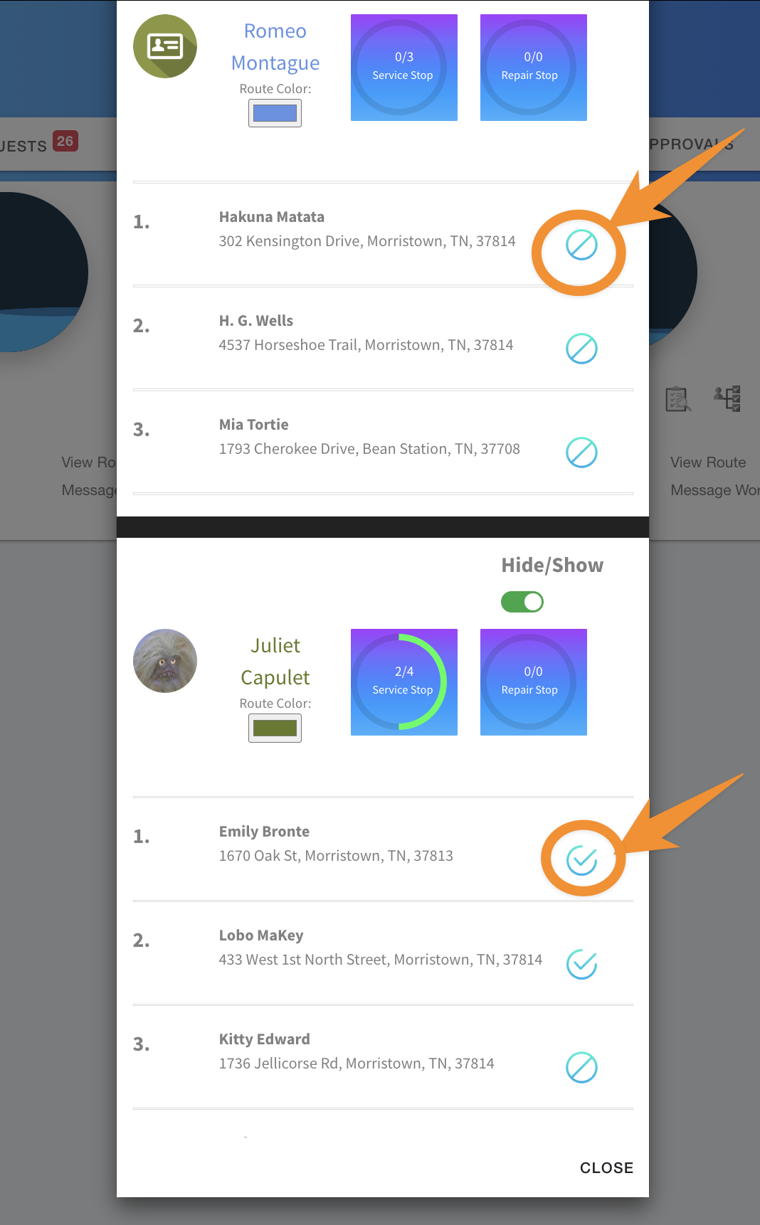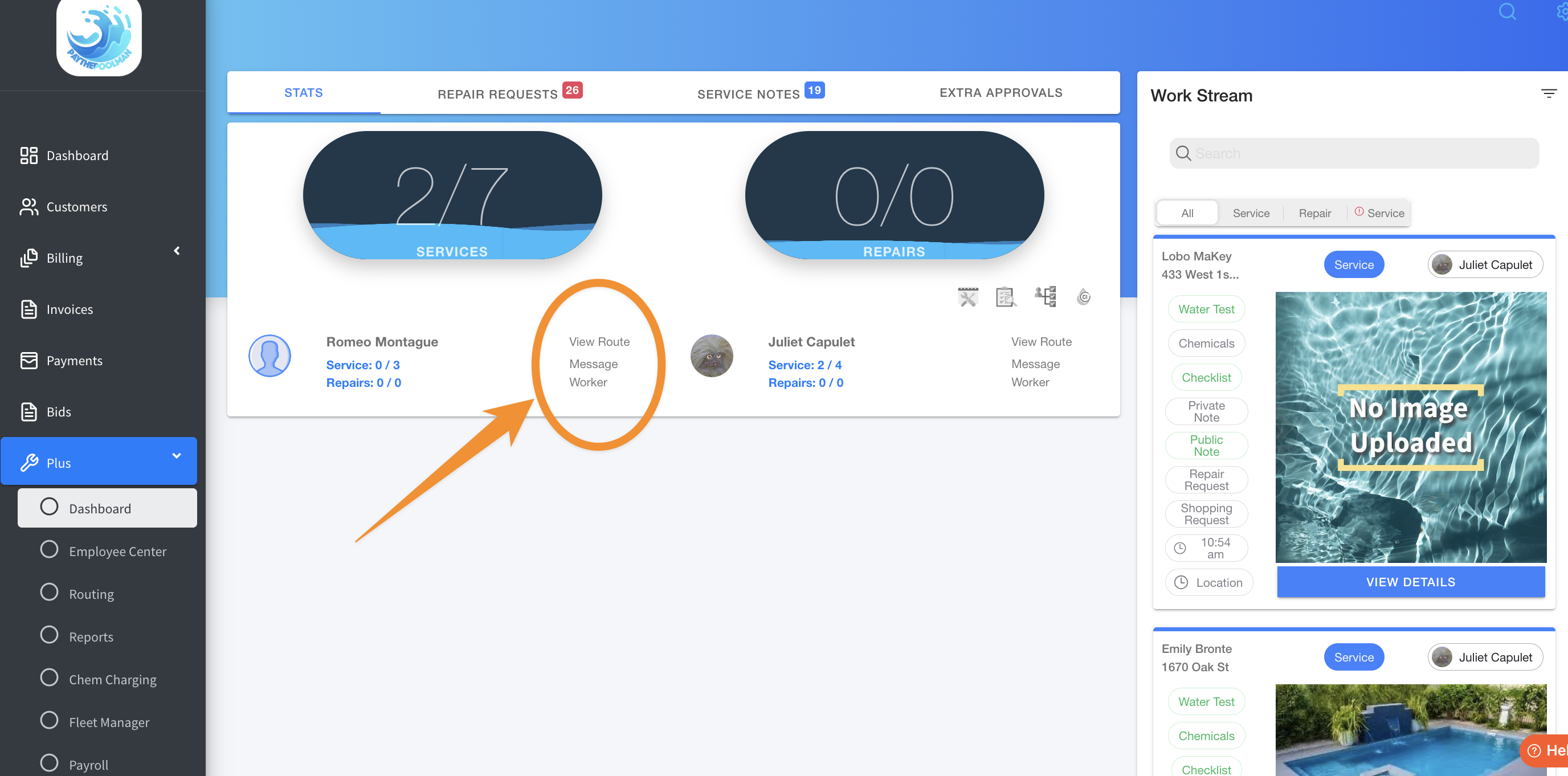 10. Finally, for each active tech, you can select to VIEW ROUTE or MESSAGE WORKER.