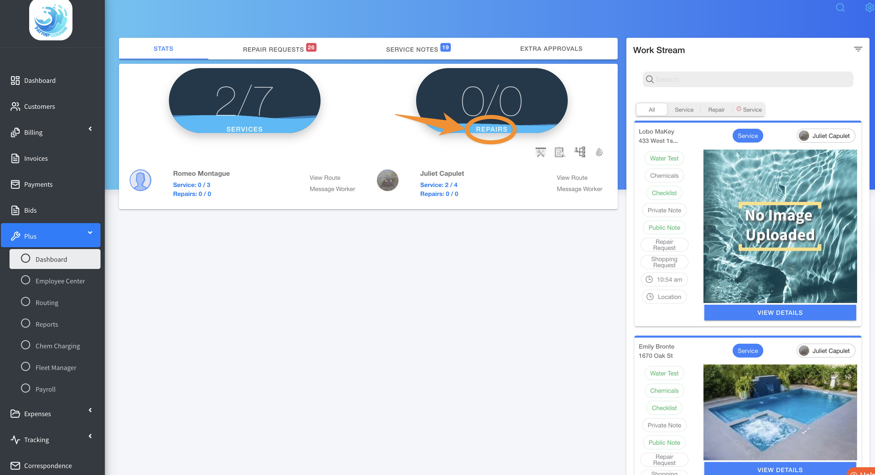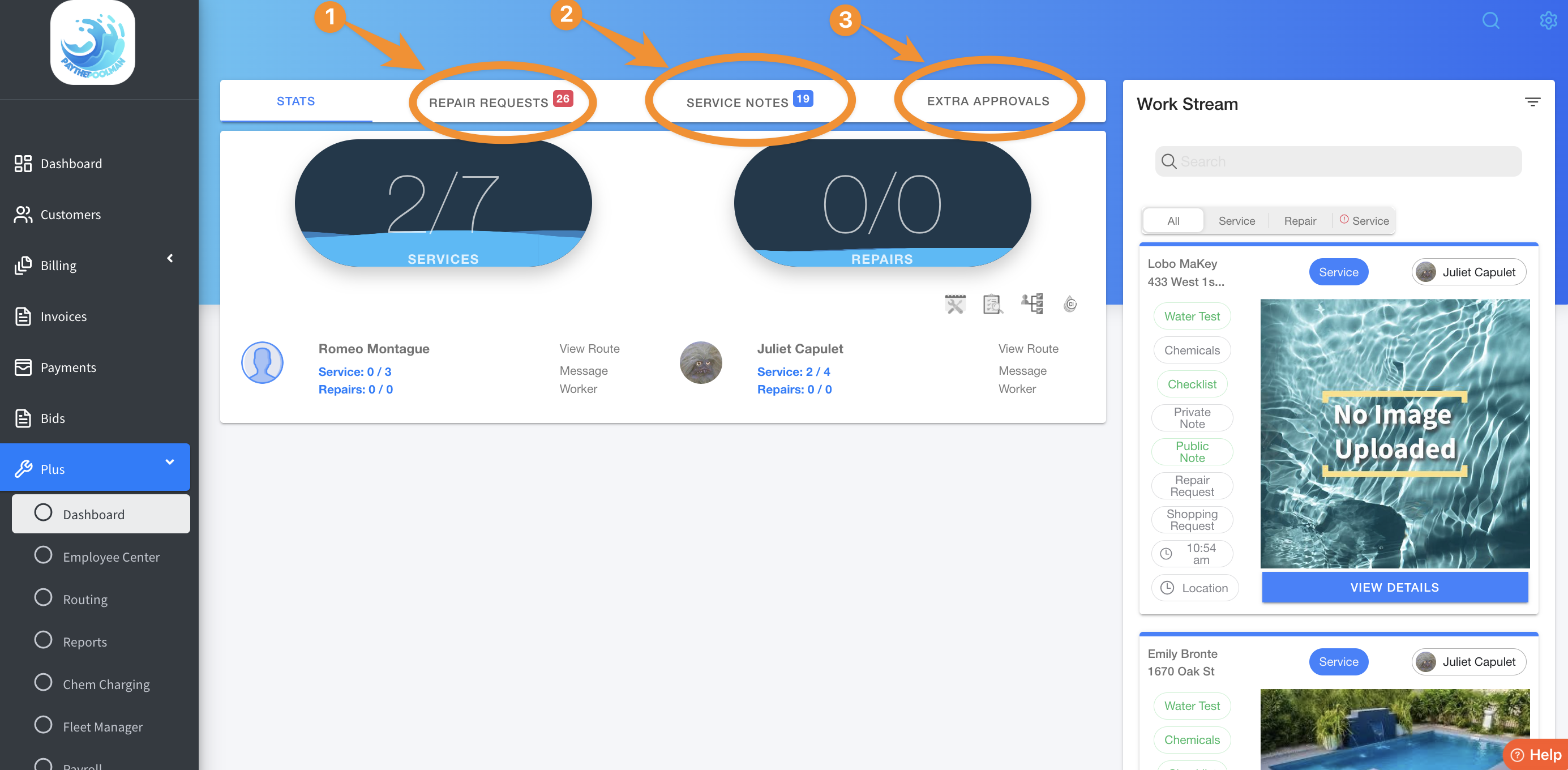 7. Back at the top, you can toggle to REPAIR REQUESTS, SERVICE NOTES or EXTRA APPROVALS: