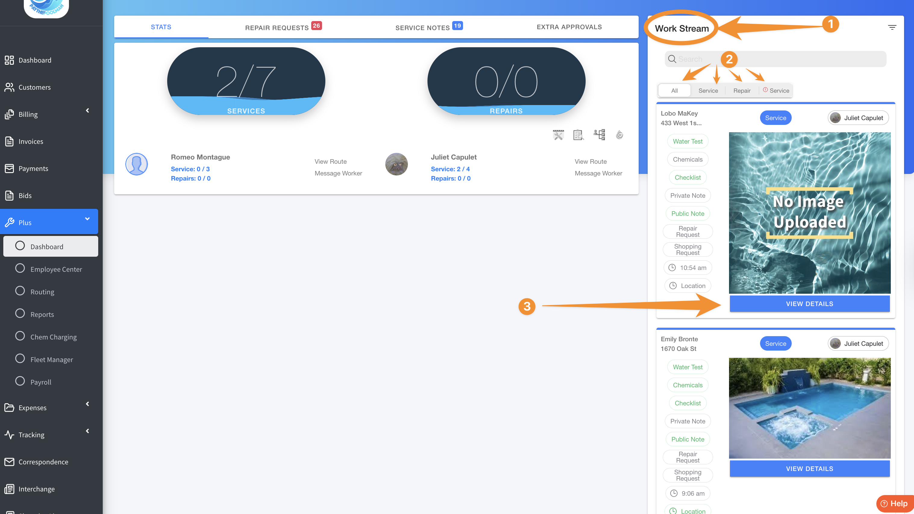 8. The WORK STREAM to the right of the screen keeps you apprised of the most current service logs. There are sorting options including ALL, SERVICE, REPAIR and/or SERVICE, and you can even click MORE DETAILS. to view the entire service log: