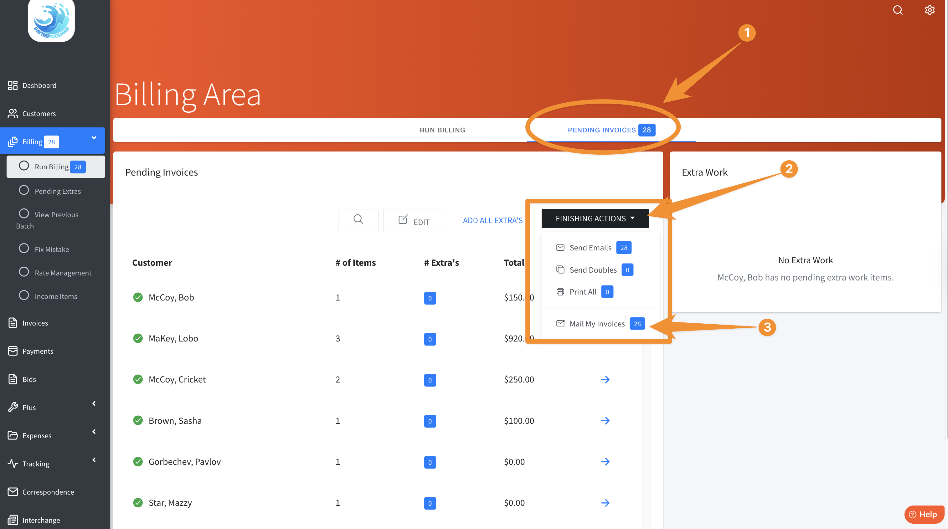 1. The mailing service option will appear after you generate a batch of Pending Invoices. Once you've generated a batch of Pending Invoices, click on the black tab, FINISHING ACTIONS, to see the pop up window as shown in the sample below.