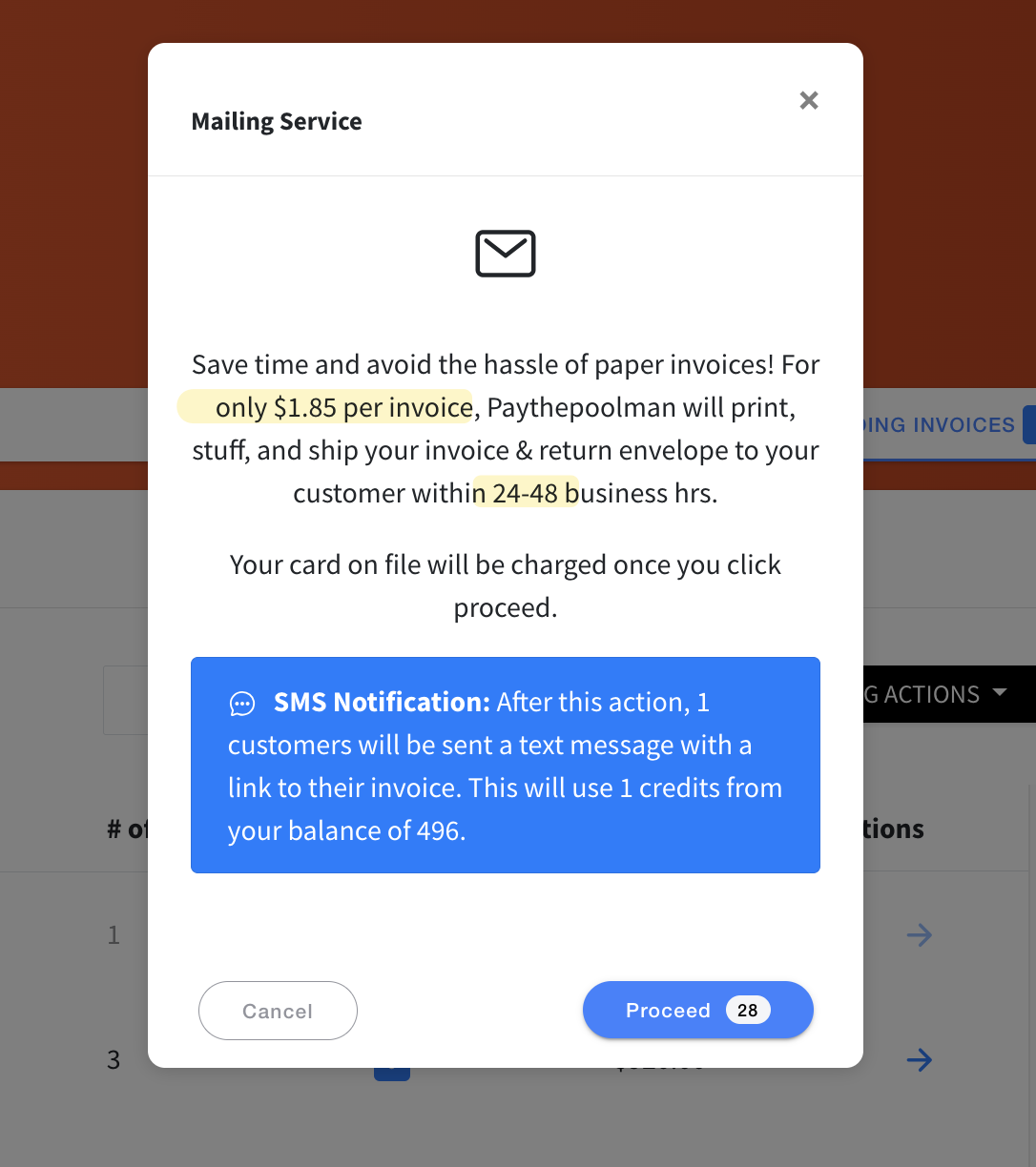 2. Just click on MAIL MY INVOICES, and you'll see the following prompt: