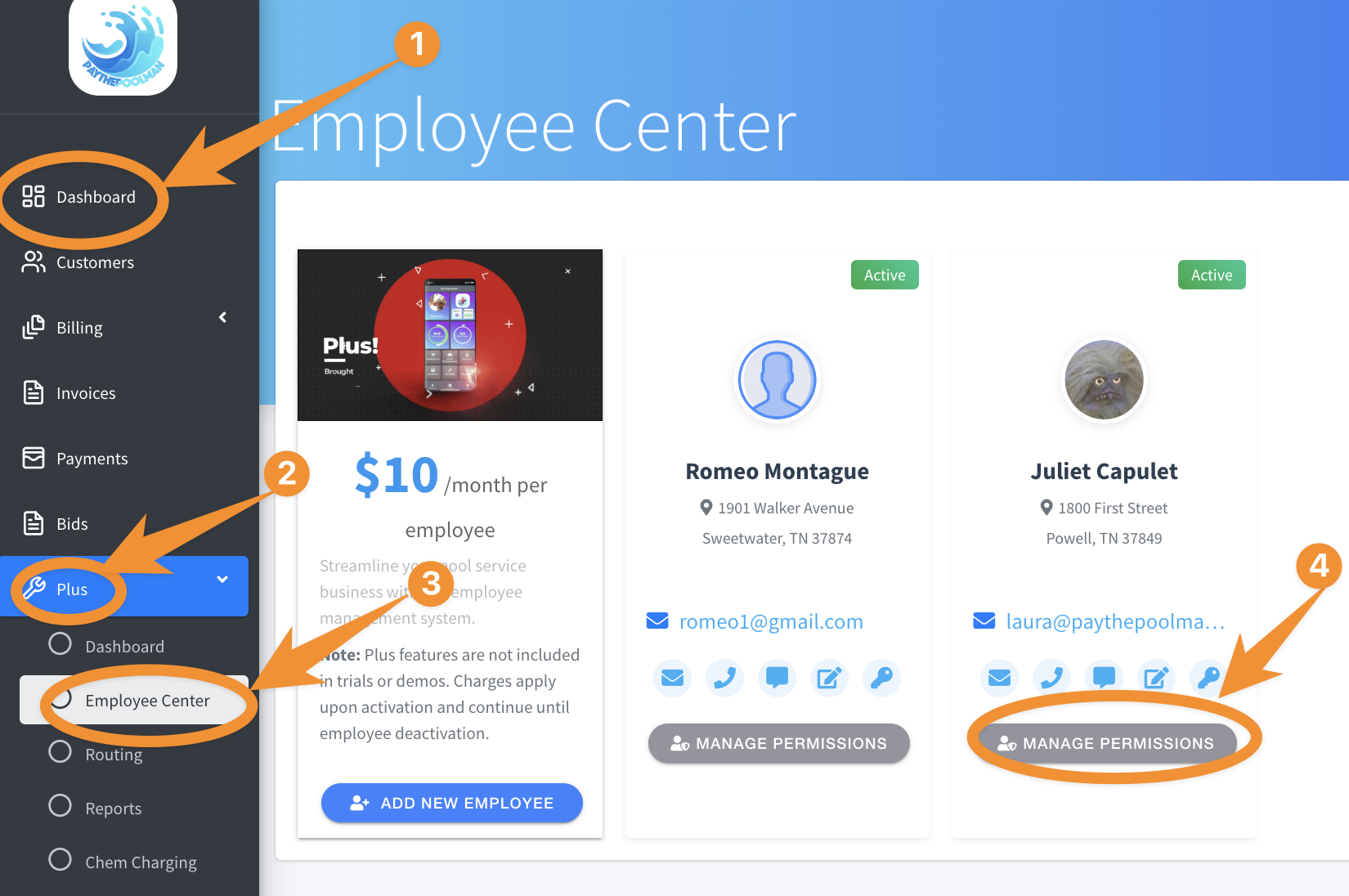 1. From your Company Dashboard, click on PLUS, then EMPLOYEE CENTER, then MANAGE PERMISSIONS: