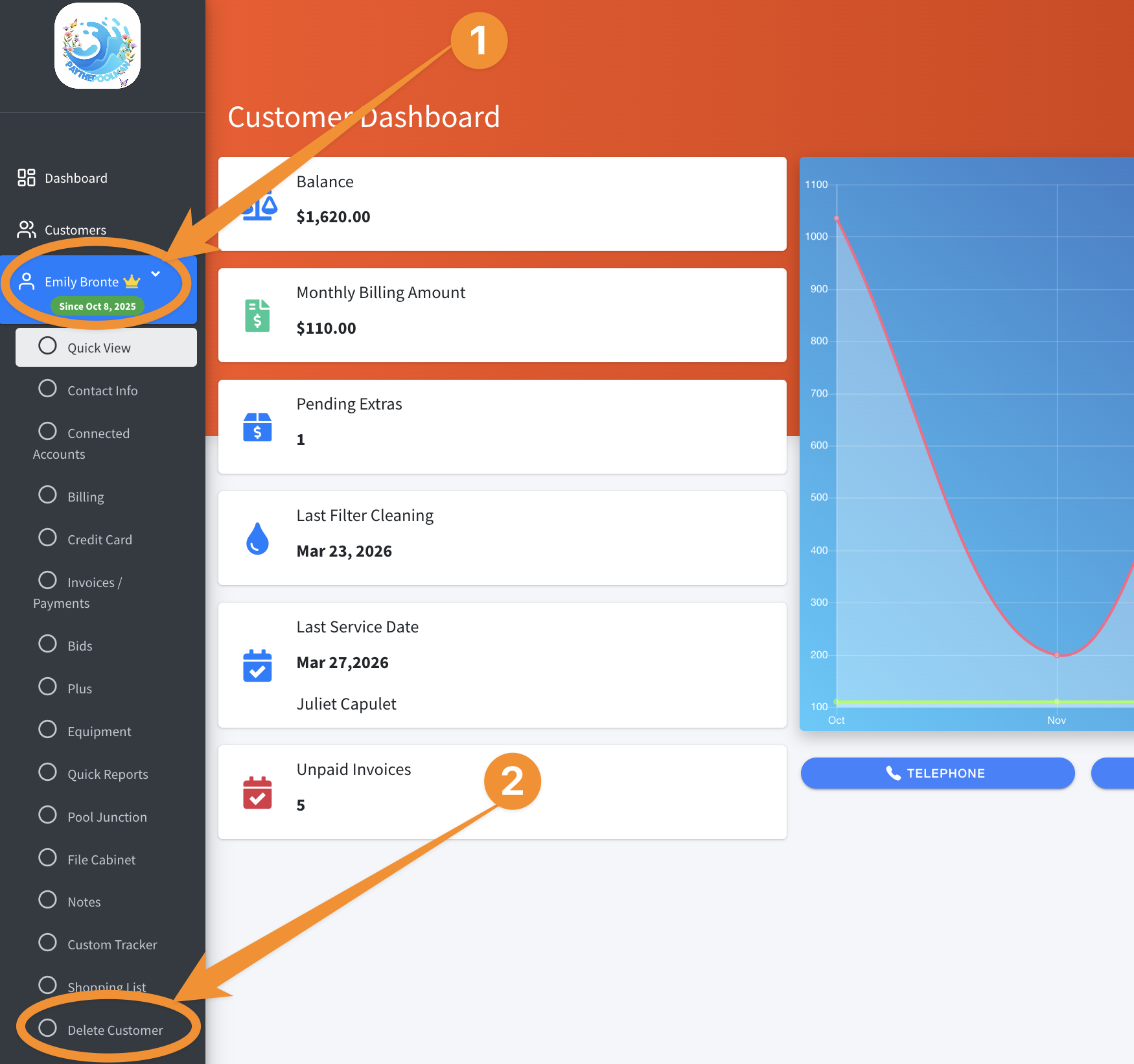 If you decide to proceed, simply go to the Customer Dashboard (customer's profile) and select DELETE CUSTOMER, then follow the prompts: